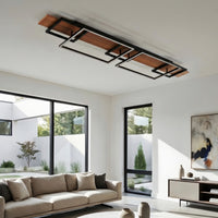 Elevate your space with this modern linear LED ceiling light, designed to deliver bold architectural style and high-performance illumination. Its elongated rectangular form features integrated LED light bars that provide bright, even coverage across large areas. The combination of matte black framing and warm wood accents creates a balanced, contemporary look suited for kitchens, living rooms, and open-concept interiors. Built for both function and design impact, it offers clean lines with strong visual presence.