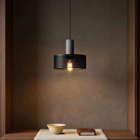 The Straton Pendant Light brings industrial sophistication to modern interiors with its textured black smoked glass cylinder shade and minimalist black cord suspension. Perfect for kitchen islands, dining rooms, living areas, and entryways, this hanging ceiling light creates dramatic ambient lighting while maintaining a clean contemporary aesthetic. The ribbed glass diffuses warm light beautifully, making it ideal for both functional task lighting and decorative accent installations.
