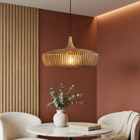 The Stratum Bamboo Pendant Light brings organic warmth to modern interiors with its handcrafted woven wood design. This ceiling pendant features a wide, shallow dome silhouette with intricate bamboo slats that cast beautiful ambient patterns when illuminated. Perfect for dining rooms, kitchen islands, living spaces, or bedroom areas where natural texture meets contemporary style. Available in natural bamboo and rich espresso finishes to complement any decorative lighting scheme.