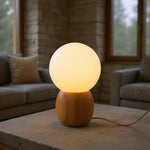 The Wood Base Globe Table Lamp brings natural warmth and gentle light together in a minimalist form. Its rounded wooden base supports a frosted glass globe that glows softly, creating a cozy atmosphere perfect for bedrooms, living spaces, or work desks. The compact design fits seamlessly into any modern or Scandinavian-inspired interior.