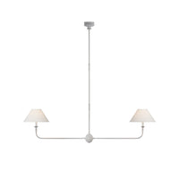 Grande Linear Chandelier brings timeless elegance to spacious interiors with its elongated silhouette and refined multi-arm design. Crafted with slender brass arms and softly tapered fabric shades, this chandelier creates a balanced, ambient glow that enhances dining rooms, kitchen islands, and open living areas. Its linear form offers visual symmetry while maintaining an airy, understated presence that complements classic, transitional, and modern farmhouse interiors.
